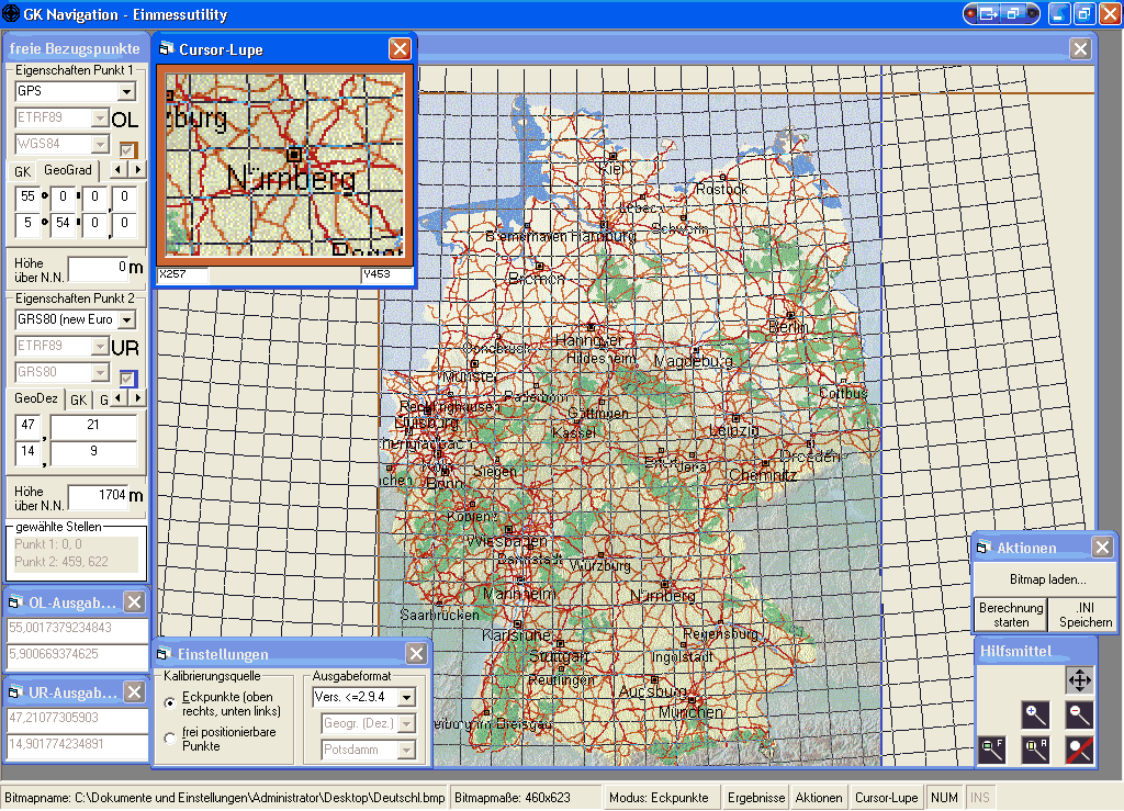 Korrektion der Gradlinienabschrägung bei großen Karten Anwendungsbereich: Keine Einschränkungen Entwicklungsstatus: bei Pocket PC: fast fertig, getestet; bei PC-Karteneinmessutility: fertig unterstütze Geräte: Keine Einschränkungen Beschreibung: Das Bild zeigt die aktuelle Version des Karteneinmessutility, ausgeführt unter Windows XP®. Es kann unter der Rubrik Downloads herunter geladen werden!